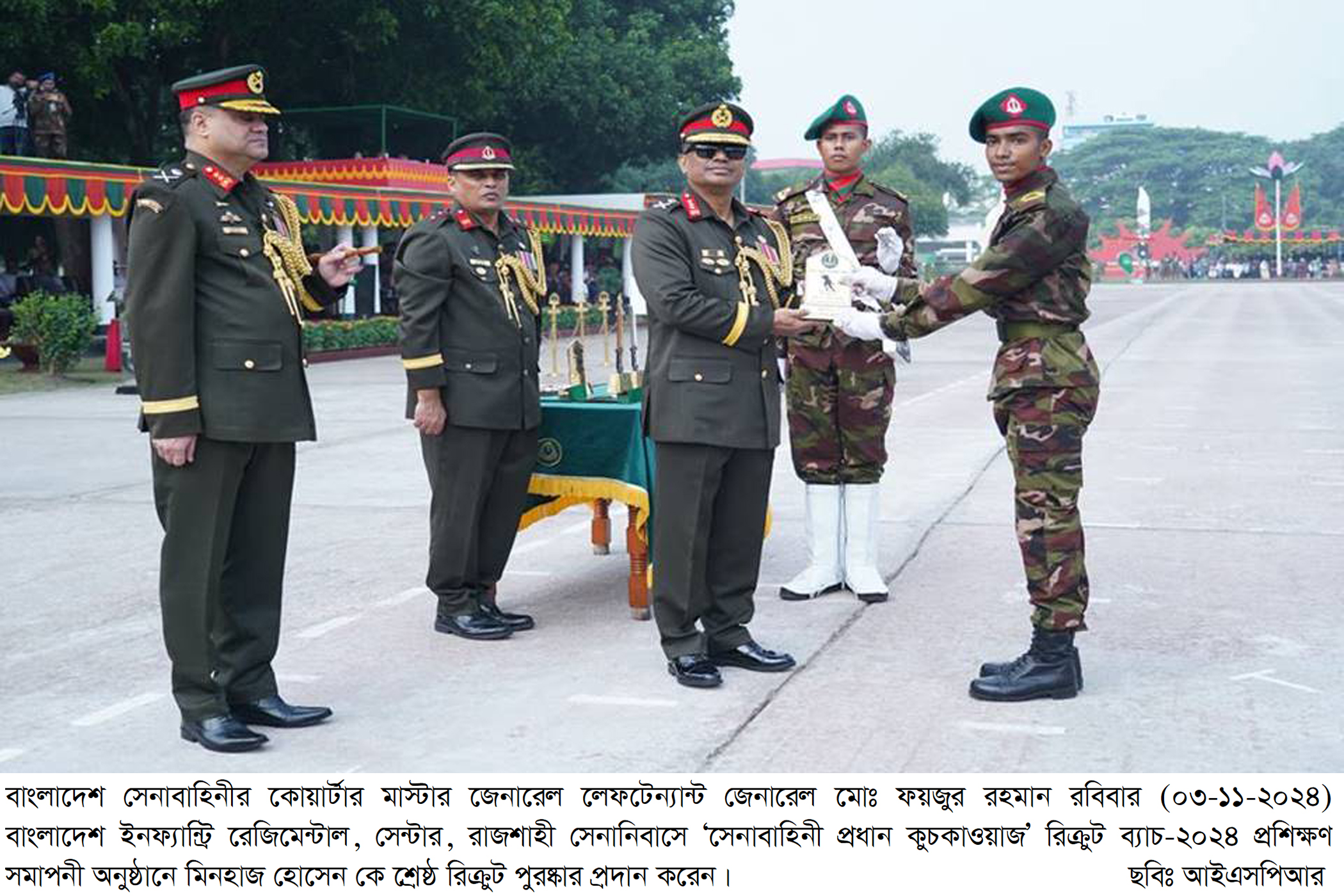Read Moreআইএসপিআর : বাংলাদেশ ইনফ্যান্ট্রি রেজিমেন্ট রিক্রুট ব্যাচ-২০২৪ এর শপথ গ্রহণ ও সমাপনী কুচকাওয়াজ অনুষ্ঠান আজ রবিবার (০৩-১১-২০২৪) বাংলাদেশ ইনফ্যান্ট্রি রেজিমেন্টাল